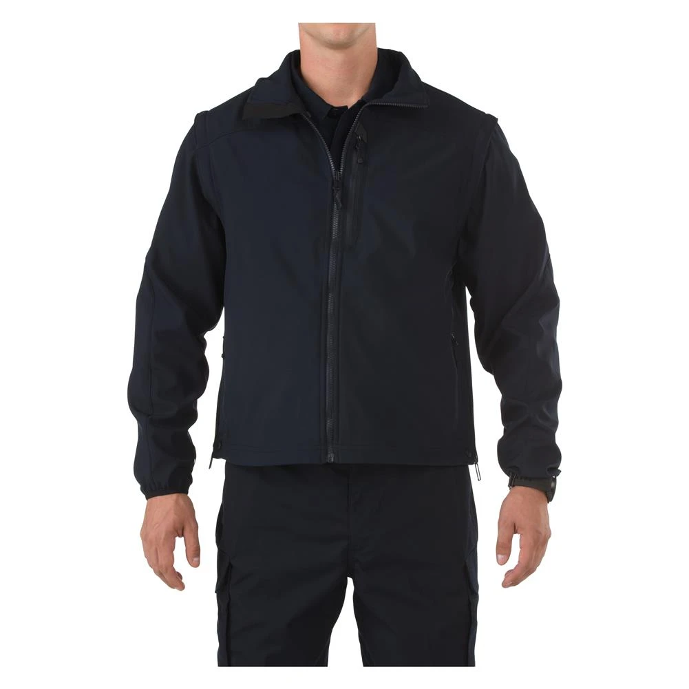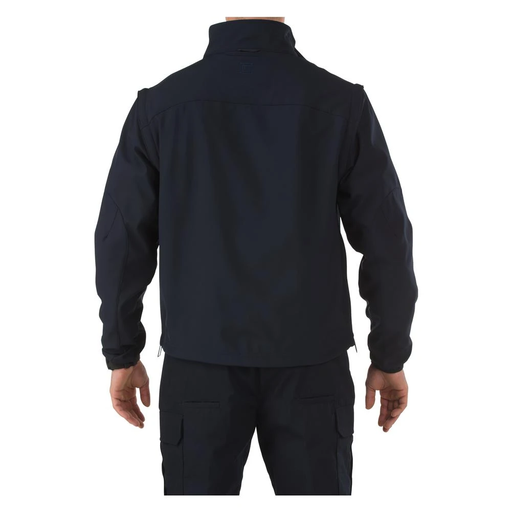 Stay comfortable in rapidly changing weather conditions with the 5.11 Valiant Softshell Jacket. Constructed with bonded polyester softshell fabric, this jacket stands up to high winds and keeps you protected against rain without weighing you down. The sleeves are removable for when the temperature rises, making this jacket adaptable to any climate or area. Built-in side zippers allow for quick access to a concealed firearm and improve ventilation. The front hand pockets are Tricot-lined for warmth, while zipper garages work to keep out moisture. To enhance durability and extend the wear, this jacket is constructed with about 9-10 stitches per seam and bar-tacks at all major stress points.