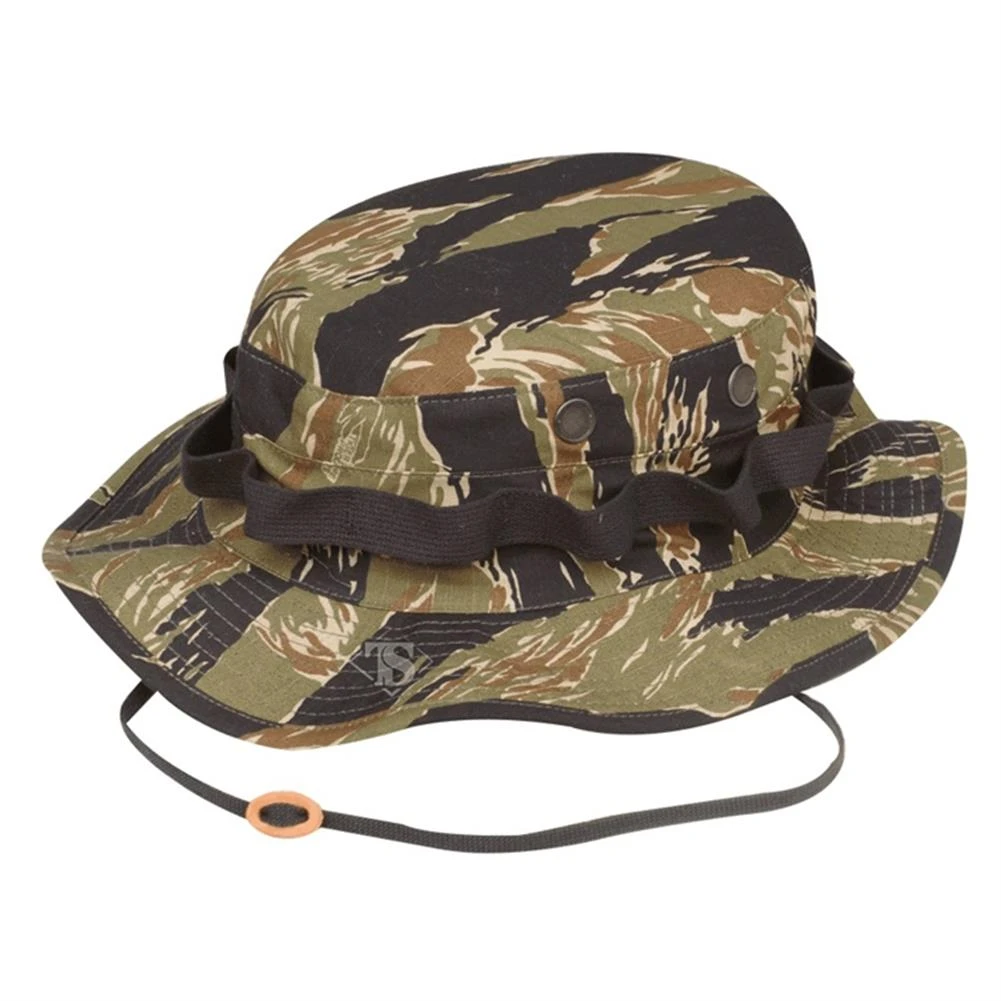 The boonie hat was introduced to the United States Armed Forces during the Vietnam War, when U.S. Army Green Berets began wearing them in the field, along with Australian and Army of the Republic of Vietnam units. These hats were locally procured; the camo cloth was usually salvaged from other uniform items or with the former from a parachute or made up by the tailor. The name is derived from “boonie”, the abbreviated form of boondocks (itself originally American military slang derived from Tagalog bundok, “mountain”, during the Philippine-American War. Made to current U.S. military specs.
