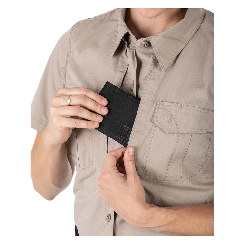 The 5.11 Women’s Stryke Shirt is purpose-built for women who are always ready. Constructed from rugged Flex-Tac mechanical stretch ripstop fabric with a Teflon finish to repel water, stains and soil, our Women’s Stryke Shirt is available in both long- and short-sleeve versions, tailored for the female physique. Dual chest pockets feature flaps, and the 5.11 Ready Pockets are ideal for storing your phone or other electronic gear. Hidden button-down collar tabs, a patented sleeve pen pocket and Melamine buttons round out the look on a shirt that is every bit as tough as your daily duties.
